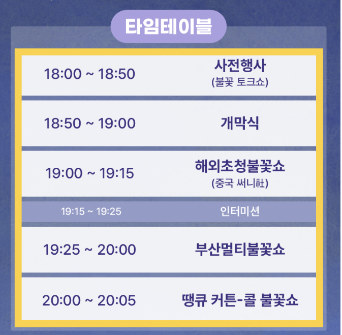 올해 부산불꽃축제는 애초 11월 5일 개최할 예정이었습니다. 하지만 10월 29일 발생한 이태원 참사로 무기한 연기했었는데요. 이번 12월 17일에 다시 개최하기로 결정했습니다. 다만, 부산시는 겨울철 기온이 떨어질 것으로 보고 개막 시간을 오후 8시에서 7시로 예년보다 1시간 앞당겨서 진행합니다.