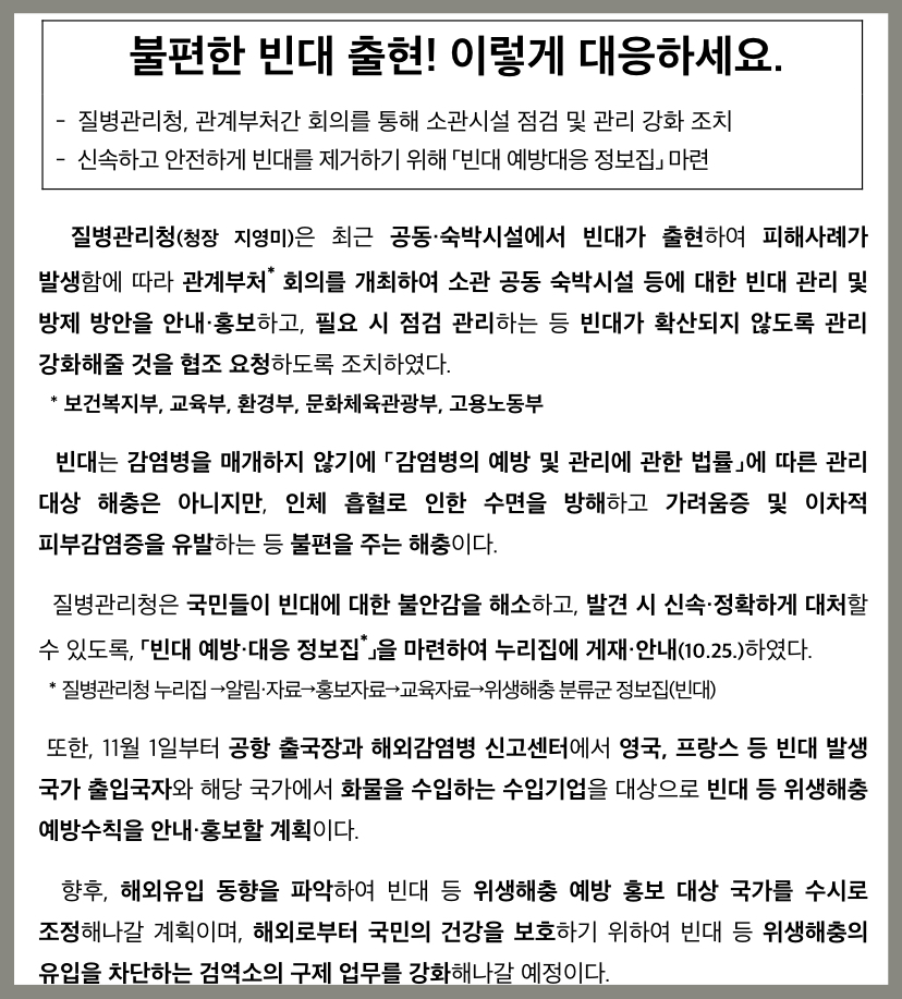 질병관리청에서는 10월 31일 관계부처와 회의를 열어 공동 숙박시설 등에 대한 빈대 관리 및 방제 방안을 공유하고 빈대가 확산하지 않도록 관리 강화를 요청했다고 밝혔습니다.