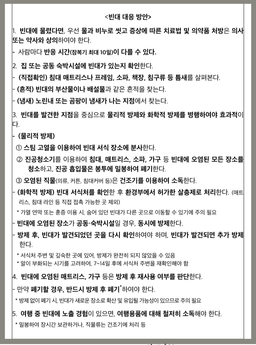 - 물리적 방제: 스팀 고열을 이용하여 빈대 서식 장소에 분사합니다. 진공청소기를 이용하여 침대, 매트리스, 소파, 가구 등 빈대에 오염된 모든 장소를 청소하고, 진공 흡입물은 봉투에 밀봉하여 폐기합니다. 오염된 직물(의류, 커튼, 침대커버 등)은 건조기를 이용하여 소독합니다.
