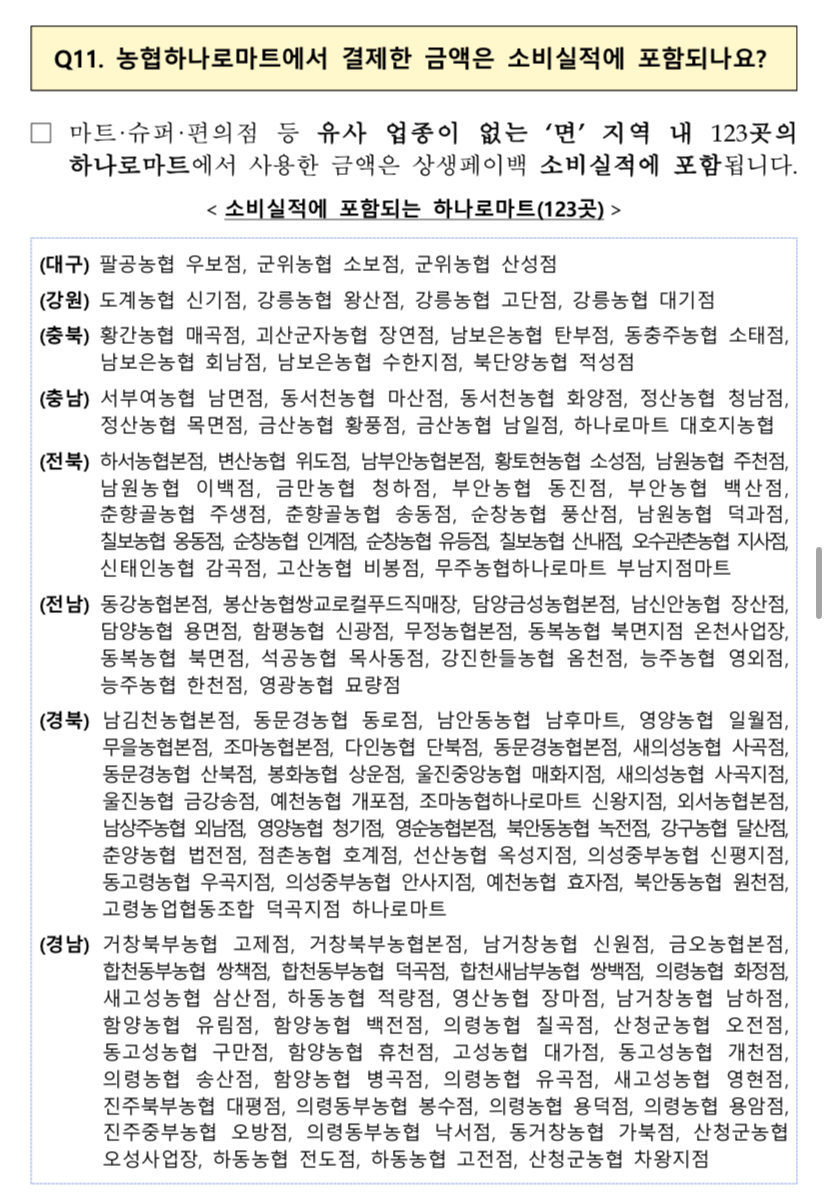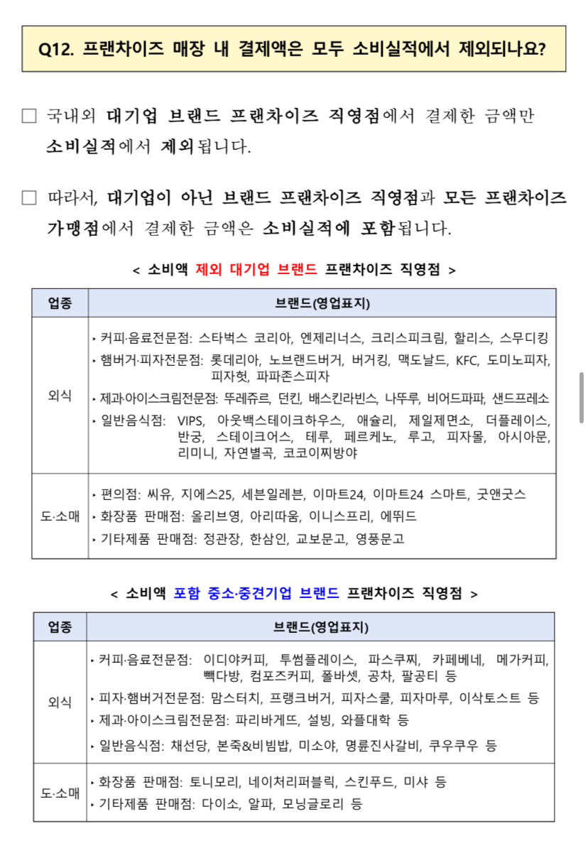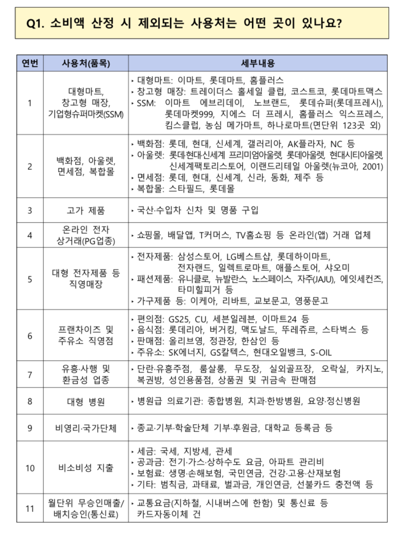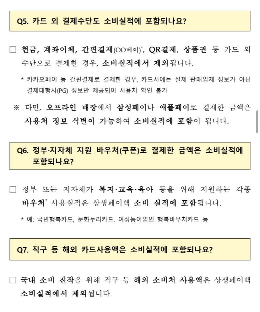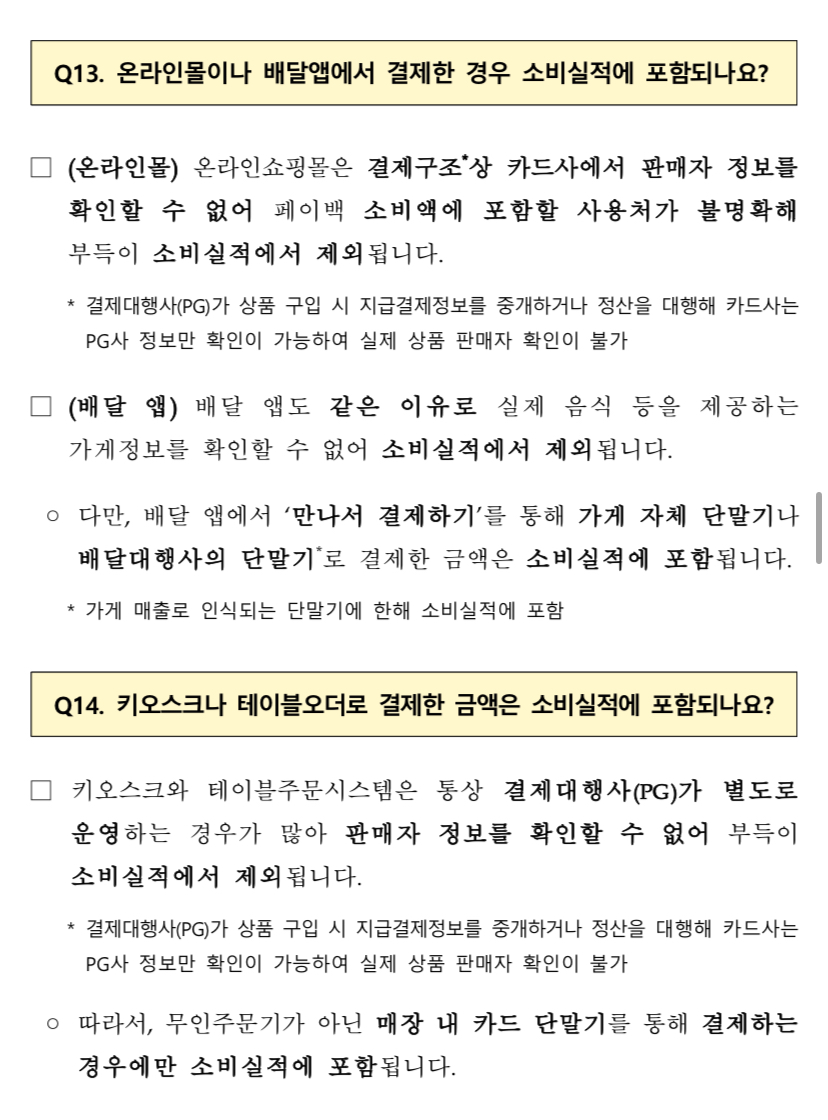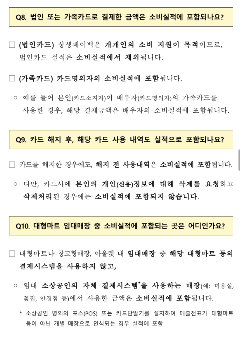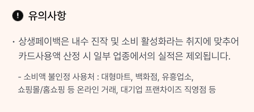 유의사항 상생페이백은 내수 진작 및 소비 활성화라는 취지에 맞추어 카드사용액 산정 시 일부 업종에서의 실적은 제외됩니다. 소비액 불인정 사용처: 대형마트, 백화점, 유흥업소, 쇼핑몰/홈쇼핑 등 온라인 거래, 대기업 프랜차이즈 직영점 등