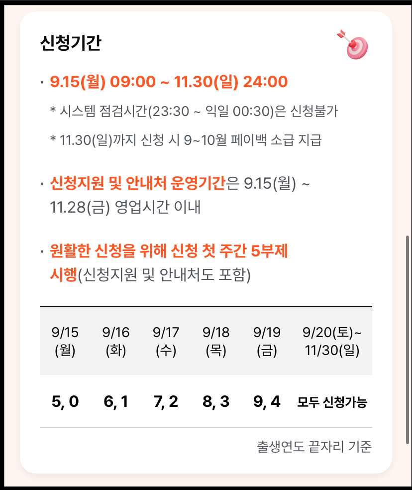 신청기간 9월 15일(월) 09:00~11.30(일) 24:00 시스템 점검시간(23:30~익일 00:30)은 신청불가 11.30(일)까지 신청 시 9~10월 페이백 소급 지급