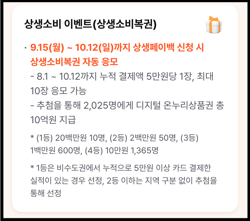 상생소비 이벤트(상생소비복권) 9.15(월)~10.12(일)까지 상생페이백 신청 시 상생소비복권 자동 응모됩니다. 8.1~10.12까지 누적 결제액 5만원당 1장, 최대 10장 응모 가능하며 추첨을 통해 2025명에게 디지털 온누리상품권 총 10억원 지급합니다.