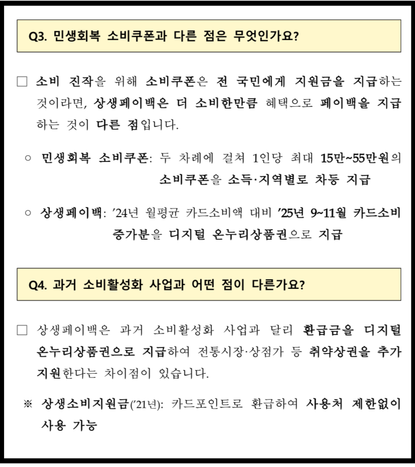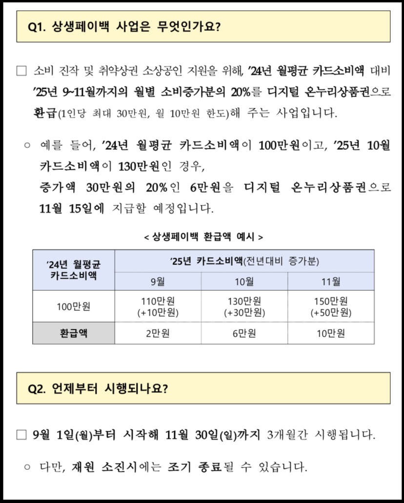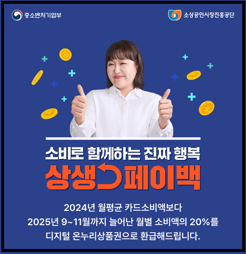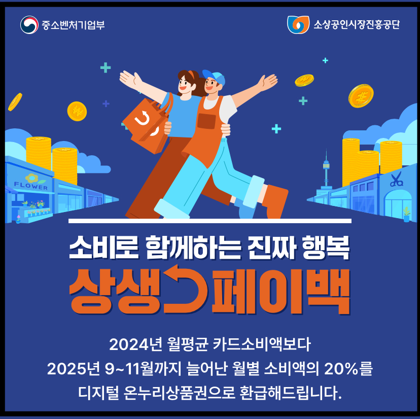 상생페이백: 2024년 월평균 카드소비약 대비 2025년 9~11월 카드소비증가분을 디지털 온누리상품권으로 지급합니다.