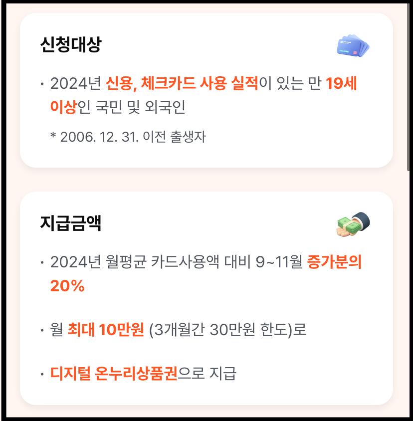 신청 자격은 어떻게 되나요 대한민국 국민과 외국인 중에서 만 19세 이상(06.12.31이전 출생자)이고 2024년에 신용 체크카드 소비실적이 있는 사람입니다.