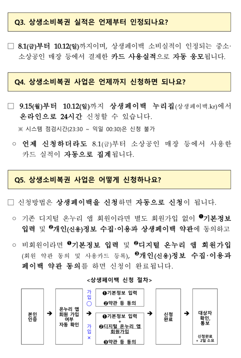 언제까지 신청해야하나요 9월 15일(월) 오전 9시부터 11월 30일(일) 자정까지 상생페이백 누리집에서 온라인으로 신청이 가능하며 한 번만 신청해도 3개월 소비증가분에 대해 페이백을 받을 수 있습니다.