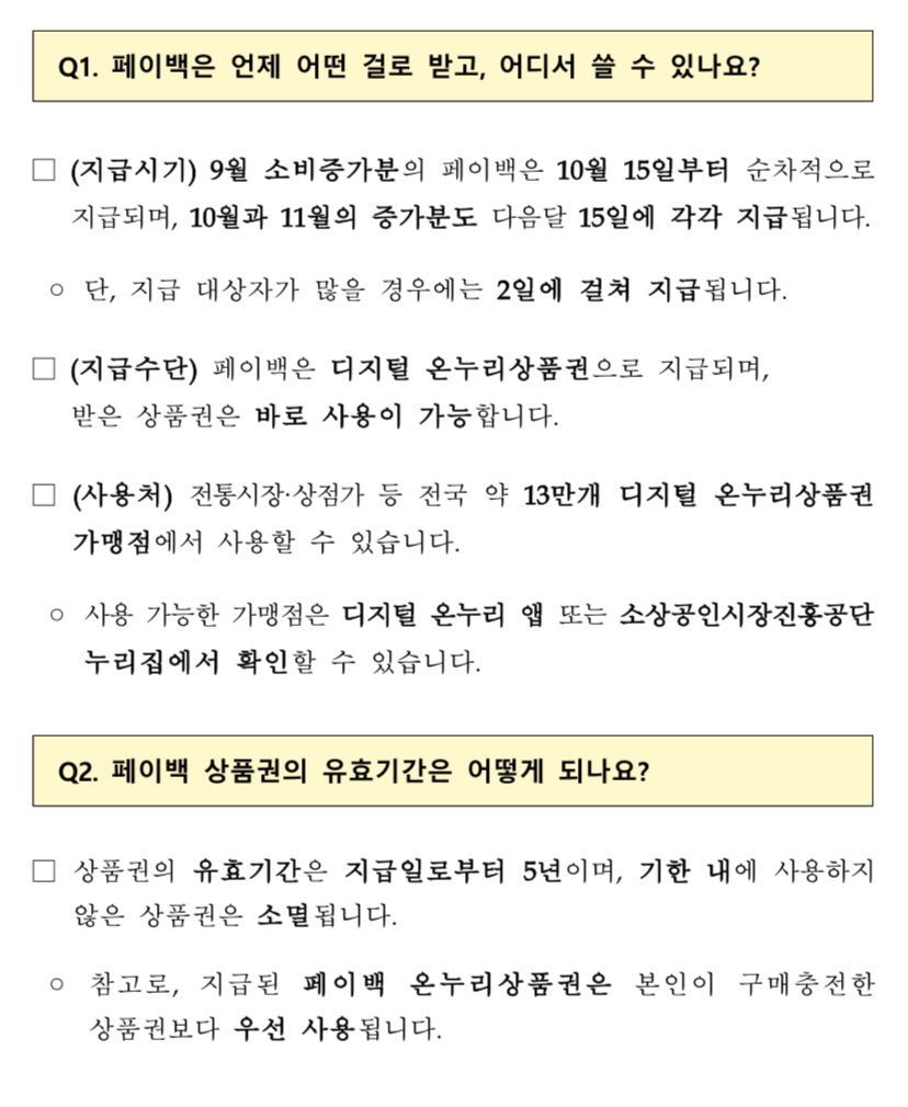 상생페이백: 2024년 월평균 카드소비약 대비 2025년 9~11월 카드소비증가분을 디지털 온누리상품권으로 지급합니다.