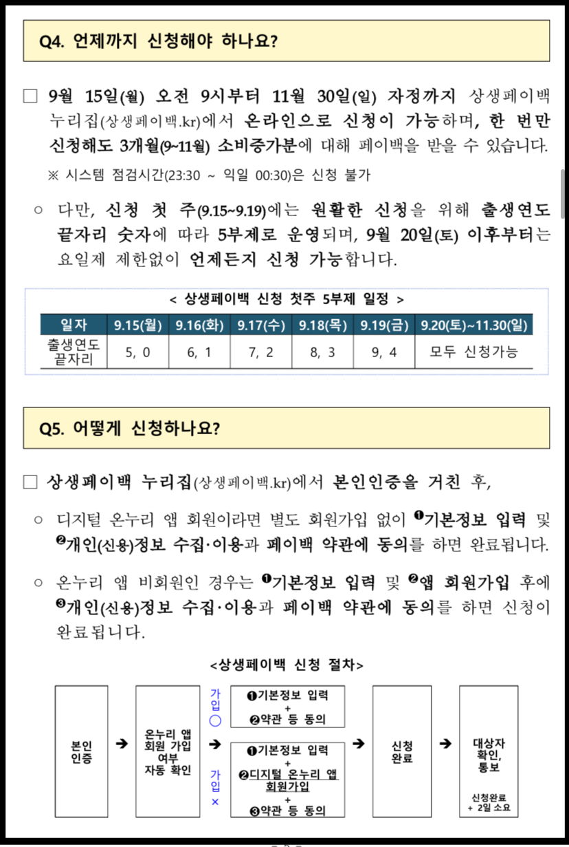 □ 9월 15일(월) 오전 9시부터 11월 30일(일) 자정까지 상생페이백 누리집(상생페이백.kr)에서 온라인으로 신청이 가능하며, 한 번 만 신청해도 3개월(9~11월) 소비증가분에 대해 페이백을 받을 수 있습니다 .