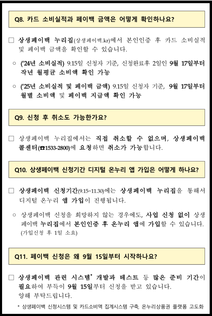 ◦ (‘25년 소비실적 및 페이백 금액) 9.15일 신청자 기준, 9월 17일부터 월별 소비액 및 페이백 지급액 확인 가능