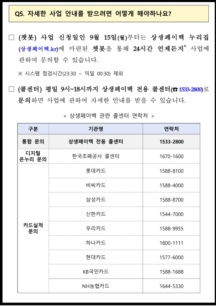□ (콜센터) 평일 9시~18시까지 상생페이백 전용 콜센터(1533-2800)로 문의하면 사업에 관하여 자세한 안내를 받을 수 있습니다.