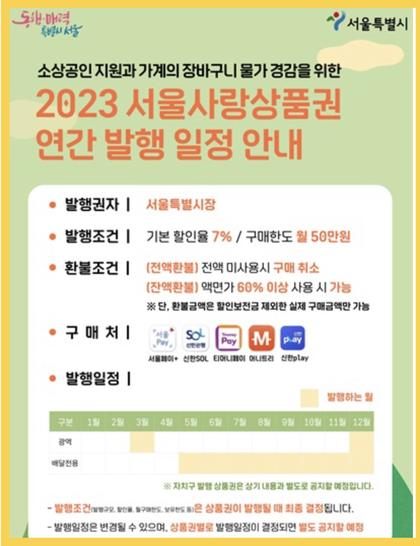 글을 마무리하며… 지금까지 서울사랑상품권 발행일정 구매방법 사용처 서울페이에 대해 살펴봤습니다. 고물가 고금리로 인해 절약하는 분들이 많은 요즘 서울사랑상품권은 7% 할인 금액으로 구매할 수 있다는 장점이 있으니 서울 전역에서 사용가능한 이번 광역 서울사랑상품권을 구매하셔서 편리하게 사용하시면 좋겠습니다.