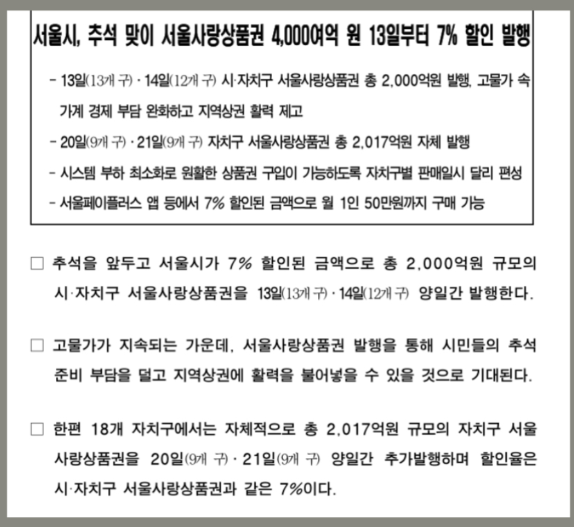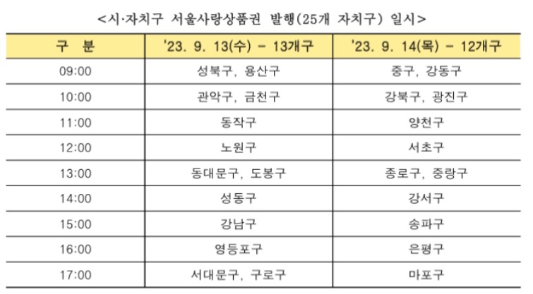 서울시.자치구 서울사랑상품권 발행은 9월 13일과 9월 14일 판매됩니다.