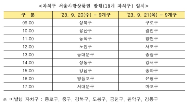 자치구 서울사랑상품권 발행은 9월 20일과 9월 21일 판매됩니다.