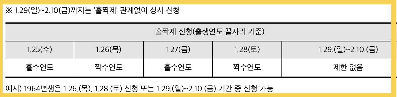 첫째주 주4일(1.25.(수)~1.28.(토))은 출생연도 끝자리에 따른 '홀짝제' 운영, 1.29.(일) 부터는 누구나 접수 가능합니다. (1.29(일)~2.10(금)까지는 '홀짝제' 관계없이 상시 신청