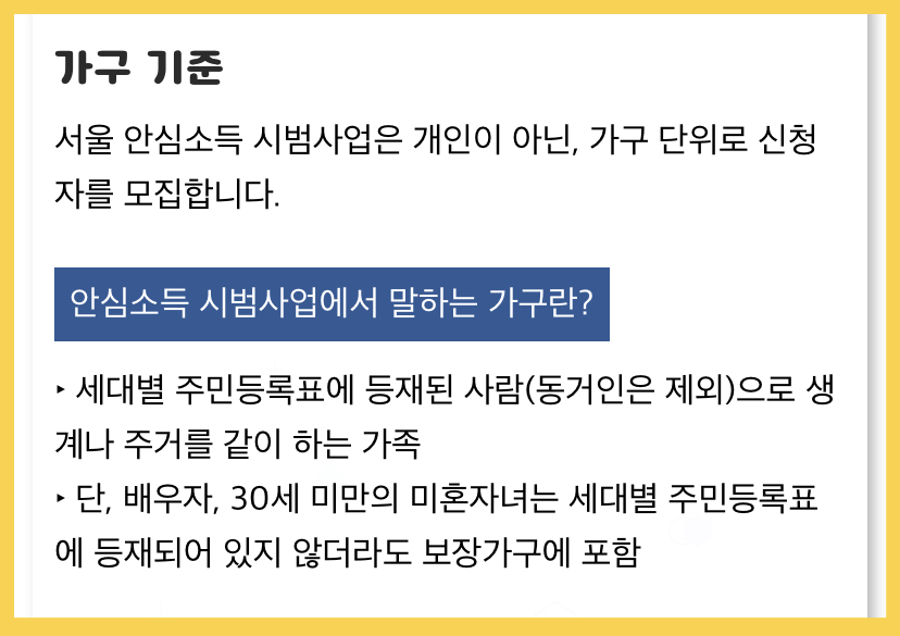 서울 안심소득 시범사업은 개인이 아닌, 가구 단위로 신청자를 모집합니다.