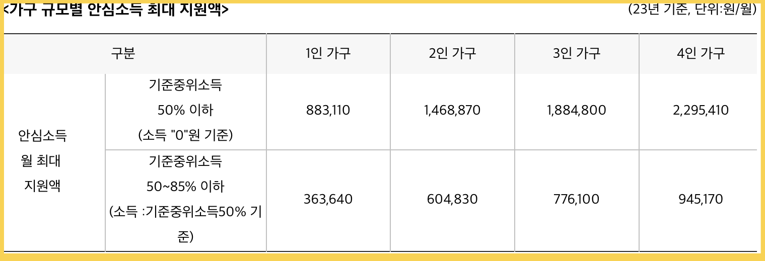 - 금액: 안심소득은 기준 중위소득 85% 미달액의 절반(50%)을 지급합니다.
