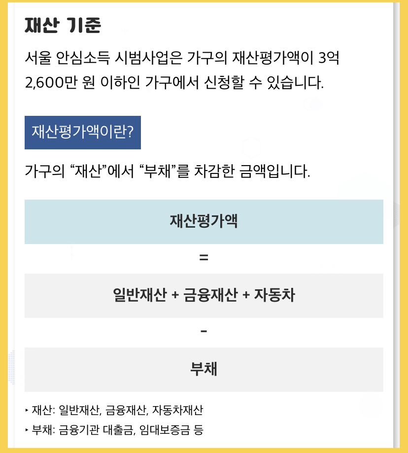 서울 안심소득 시범사업은 가구의 재산평가액이 3억 2,600만 원 이하인 가구에서 신청할 수 있습니다.