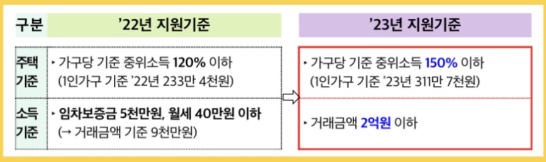 기존에는 주택기준이 전월세 임차보증금 5000만 원, 월세 40만 원 이하였지만 올해부터 전세보증금이나 월세 환산 보증금이 2억 원 이하로 완화됩니다. 이것은 2022년 서울 전세 거주 청년의 중위 전세보증금이 2억 원으로 조사되어 혜택을 받기 어려운 청년이 많다는 이유에서 입니다.
