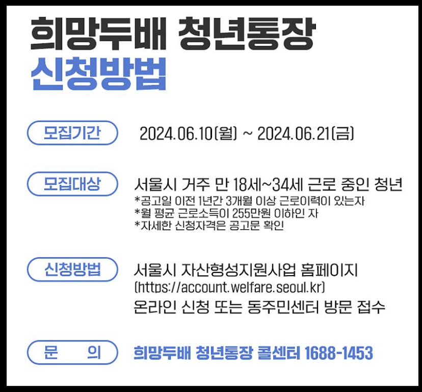 - 신청방법: 온라인 접수(서울시복지재단 자산형성지원사업 account welfare seoulkr)