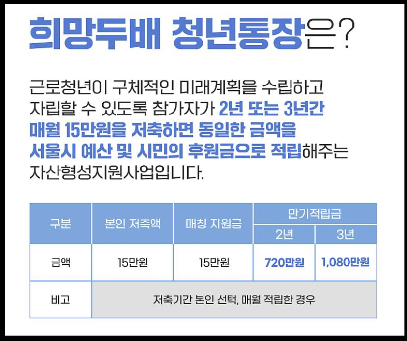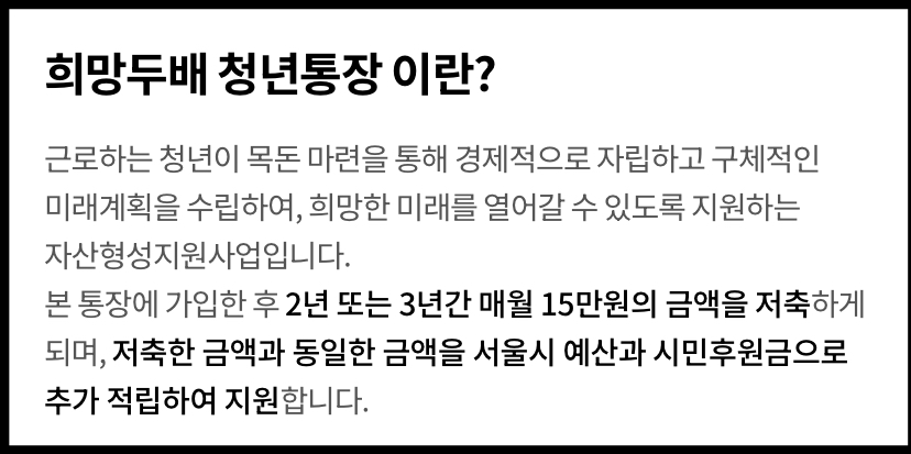서울시 희망두배 청년통장은 서울시 거주 청년이 매월 15만원을 2년 또는 3년간 저축하면 서울시 예산과 민간 재원으로 저축액 100%를 추가로 적립해 주는 자산형성지원사업입니다.