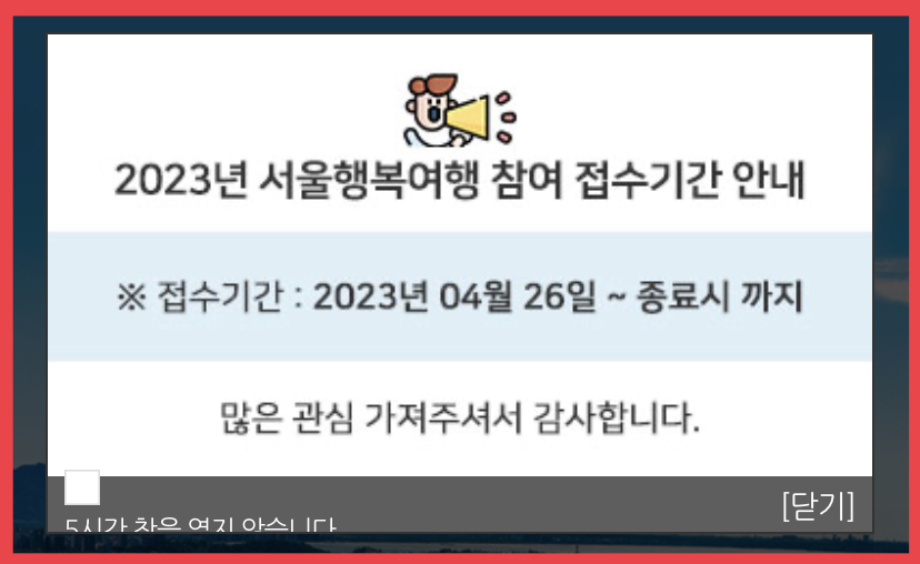 - 모집대상: 서울 거주 만 6세 이상의 관광진흥법 시행령상 관광취약계층으로 기초생활보장 수급자 및 차상위계층, 한부모가족 등에 해당되시는 분입니다.
