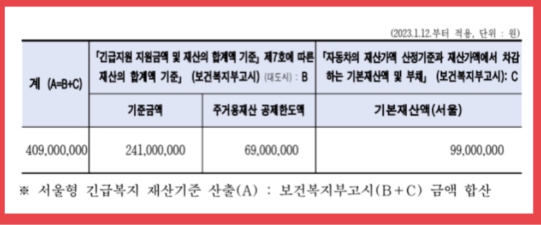 한시적 기준 완화가 종료되면 재산기준이 3억 1,000만 원으로 돌아가야 하지만, 조례 시행규칙 개정으로 인해 2023년 기준, 재산기준에서 차감하는 주거용재산 공제한도액 6,900만 원을 적용하여 재산이 4억 900만 원 이하인 가구까지도 지원 대상이 됩니다.