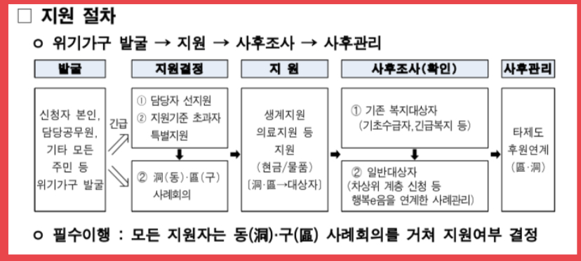 - 복지 사각지대를 없애기 위한 방법으로 복지 수급 이력이 없는 가구도 위기 상황에 처한 경우에 지원 기준을 충족하지 않더라도 지원받으실 수 있는데요. 최초 1회에 한해 생계지원을 선제적으로 지원받게 됩니다.