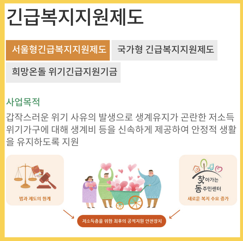 2015년부터 시행된 제도로 위기상황에 처한 가구를 기초생활보장법과 서울형 기초보장 등 다른 법령, 조례 등에 따른 지원을 하기 전에 일시적으로 신속하게 지원하기 위한 제도입니다.