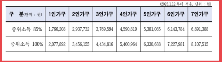 4인가구 기준으로 기존에는 소득이 459만819원 이하(중위소득 85% 이하)였습니다. 그런데 2023년부터는 540만964원 이하(중위소득 100% 이하) 가구까지 지원받을 수 있게 됩니다.