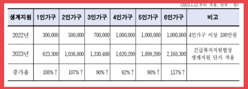4인가구 기준으로 기존에는 소득이 459만819원 이하(중위소득 85% 이하)였습니다. 그런데 2023년부터는 540만964원 이하(중위소득 100% 이하) 가구까지 지원받을 수 있게 됩니다.