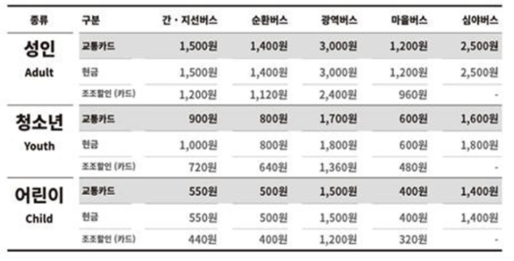 인상 금액은 일반 카드 기준으로 시내버스는 간·지선 1500원이고, 순환·차등 1400원이며, 광역은 3000원, 심야 2500원, 마을버스 1200원이 됩니다.