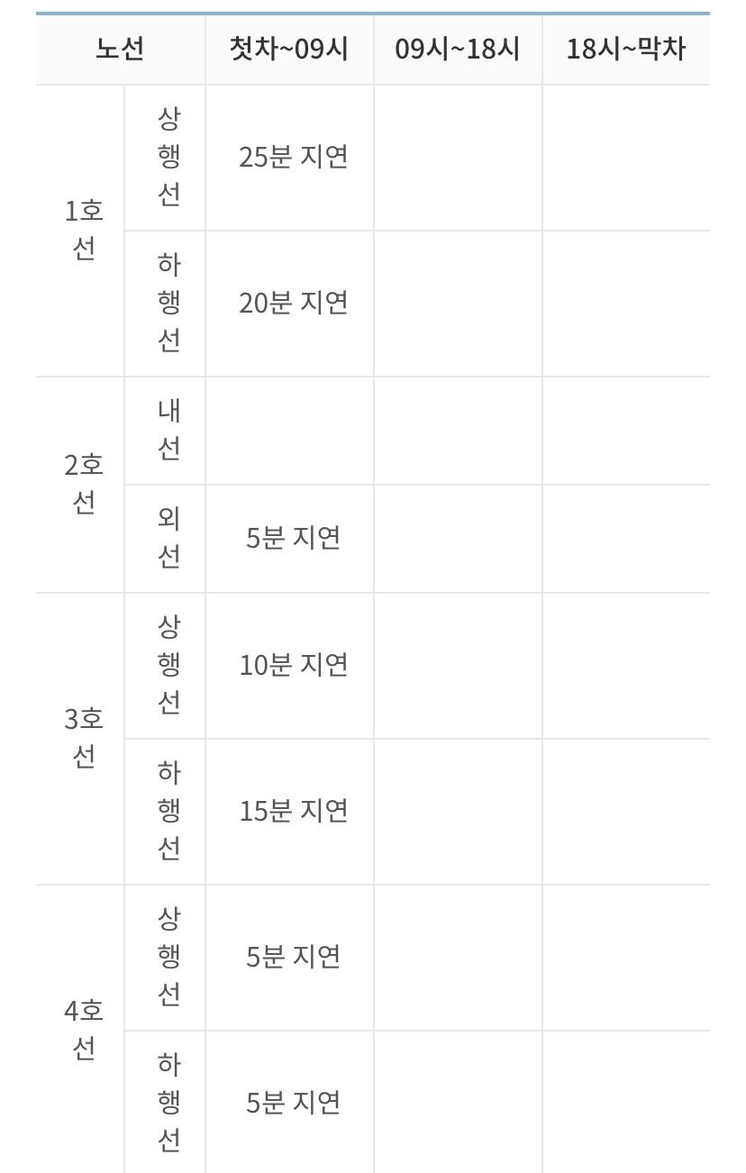 아래 1호선, 2호선, 3호선, 4호선, 5호선, 6호선, 7호선, 8호선의 지연된 시간을 확인하실 수 있습니다.
