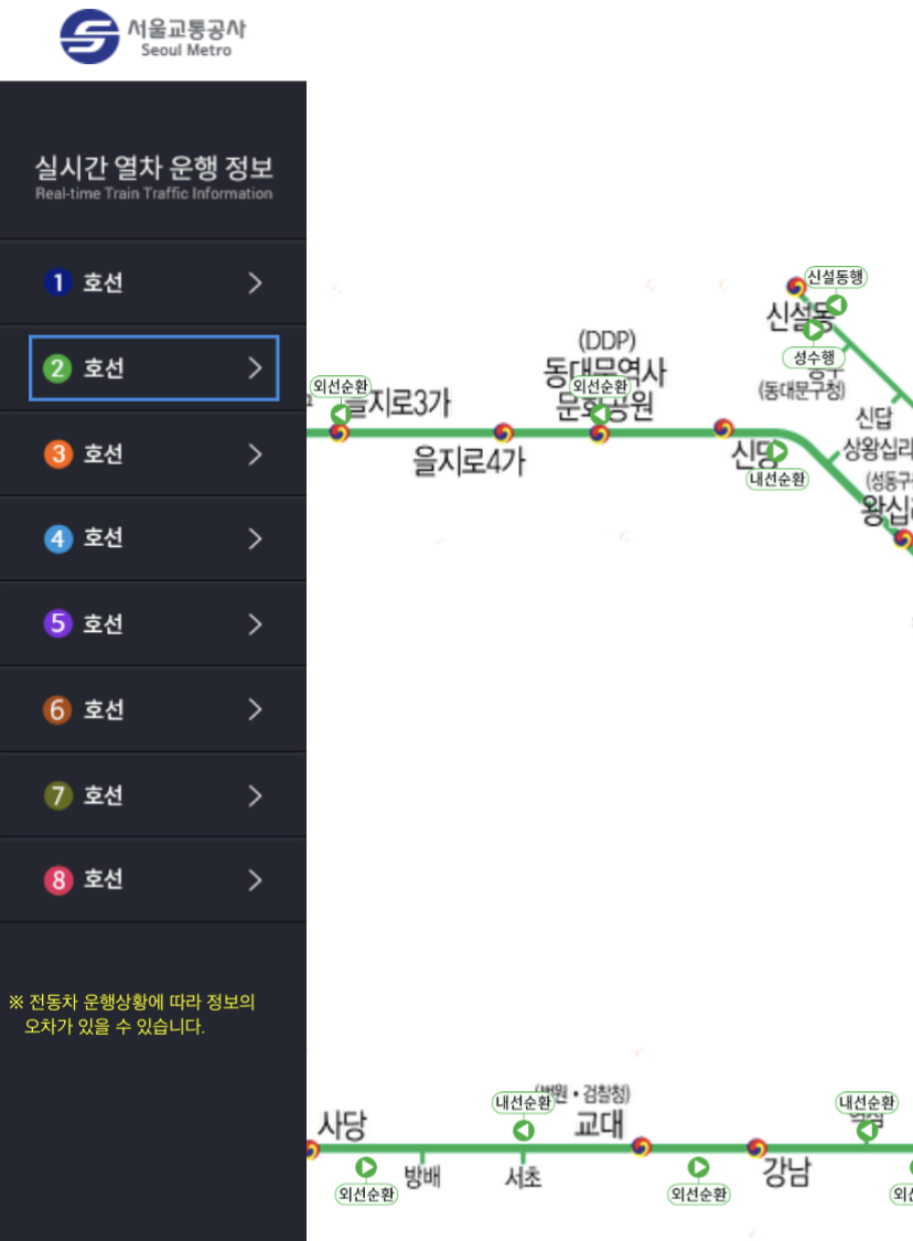 1호선부터 8호선까지의 실시간 열차 운행 정보를 지하철 노선도를 보면서 확인이 가능합니다.