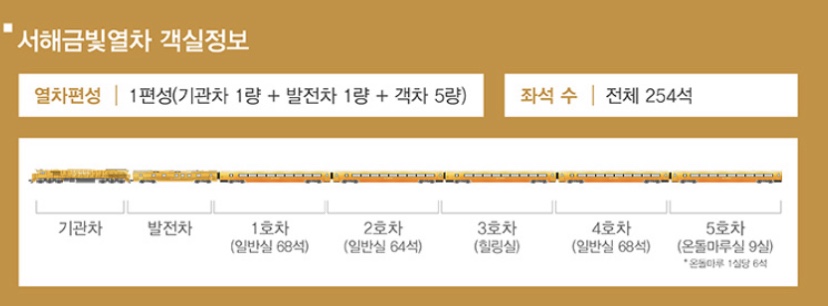 객차는 총 5량으로 5호차에는 온돌마루실이 9실 있습니다.
