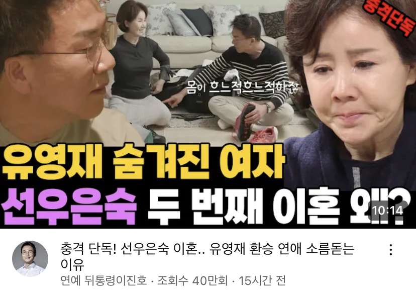 연예뒤통령 유튜버 이진호는 유영재 입장에서는 단 8일 만에 선우은숙과 혼인신고를 마쳐야 하는 분명한 이유가 있었던 것이라면서 A씨는 당시 충격에 빠질 수밖에 없었고 괴로운 마음에 한동안 술독에 빠져 지냈다고 한다고 했습니다.