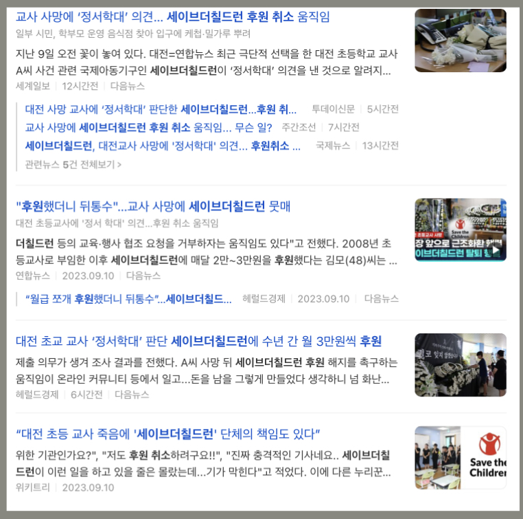 대전 초등교사의 극단적 선택으로 많은분들이 가슴아파하고 계실것 같습니다. 가해자 학부모에 대한 신상과 운영하는 미용실, 김밥집까지 알려지면서 논란이 되고 있는데요. 이번에는 대전 초등교사가 조사 과정에서 국제아동권리단체인 세이브더칠드런이 정서학대 의견을 냈다고 한 것이 알려지면서 많은 지탄을 받고 있습니다. 그럼 세이브더칠드런 후원 취소 정서학대 대전 초등교사에 대해 자세히 알아보도록 하겠습니다.