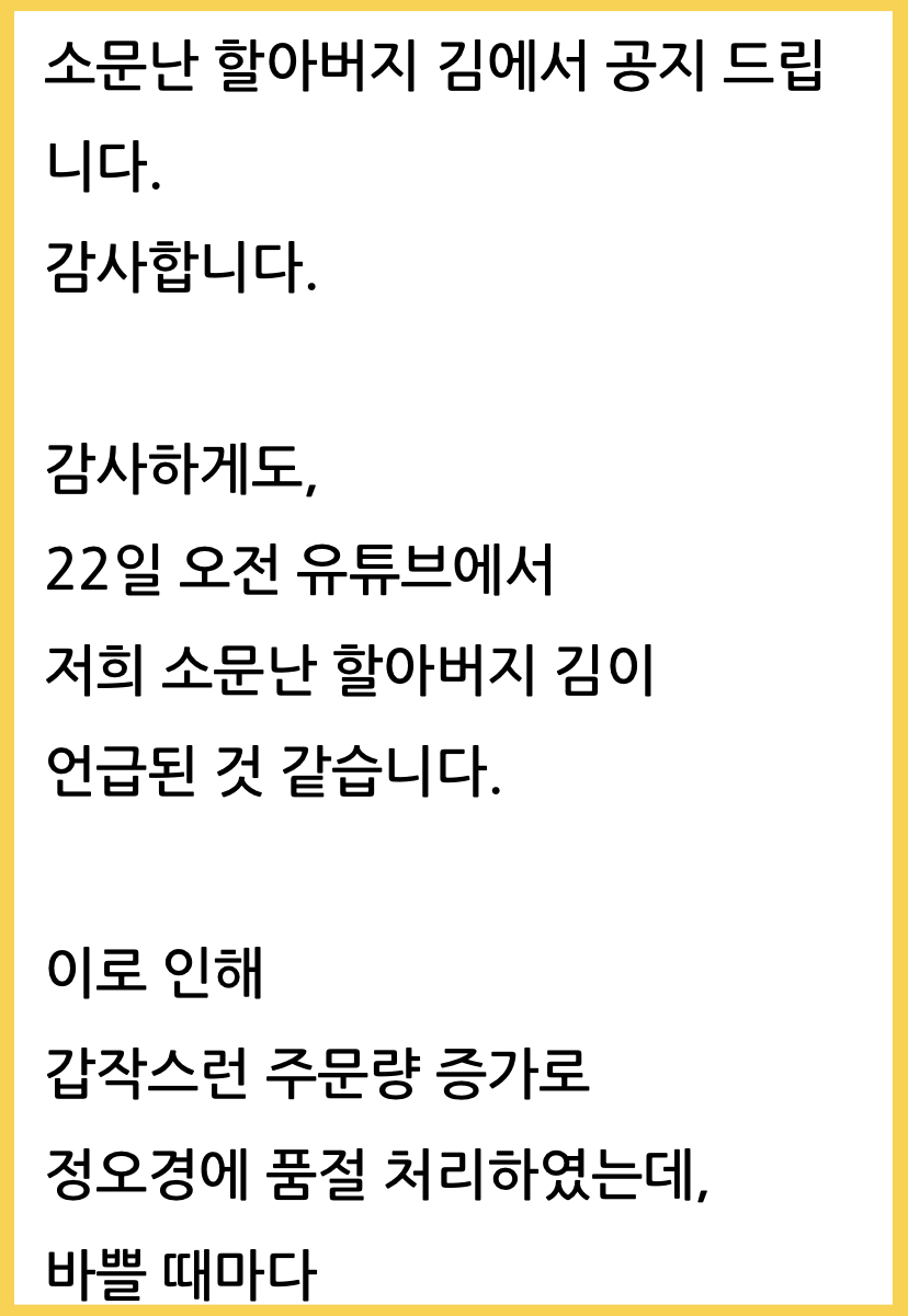 소문난 할아버지 김 공지 : 유튜브 언급으로 갑작스런 주문량 증가에 품절처리되었다는 내용