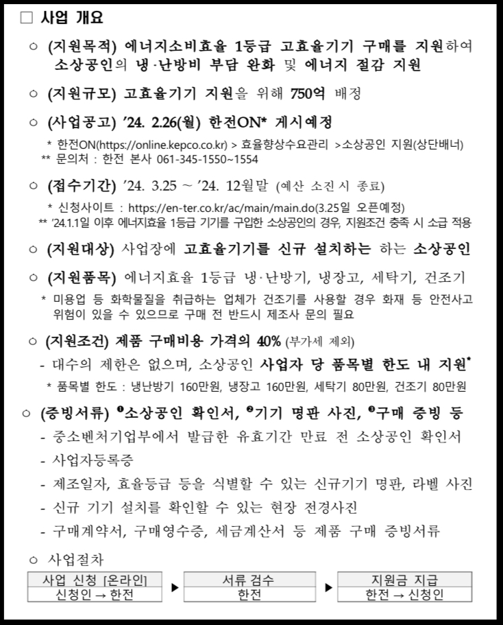 - 지원목적: 에너지소비효율 1등급 고효율기기 구매를 지원하여 소상공인의 냉‧난방비 부담 완화 및 에너지 절감 지원