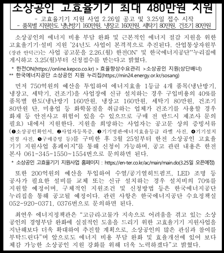 산업통상자원부에서는 3월 25일부터 소상공인분들에게 고효율 냉·난방기, 세탁기, 건조기, 냉장고 구매 시 최대 40%를 합산 금액으로 최대 480만원을 지원해 드립니다. 이러한 내용의 소상공인 고효율 기기 지원 사업 신청을 받습니다.
