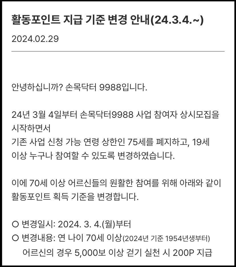 - 걷기포인트: 70세(’54년생) 이상 어르신 5천보 걷기 실천 시 포인트(200P) 지급해 드립니다.