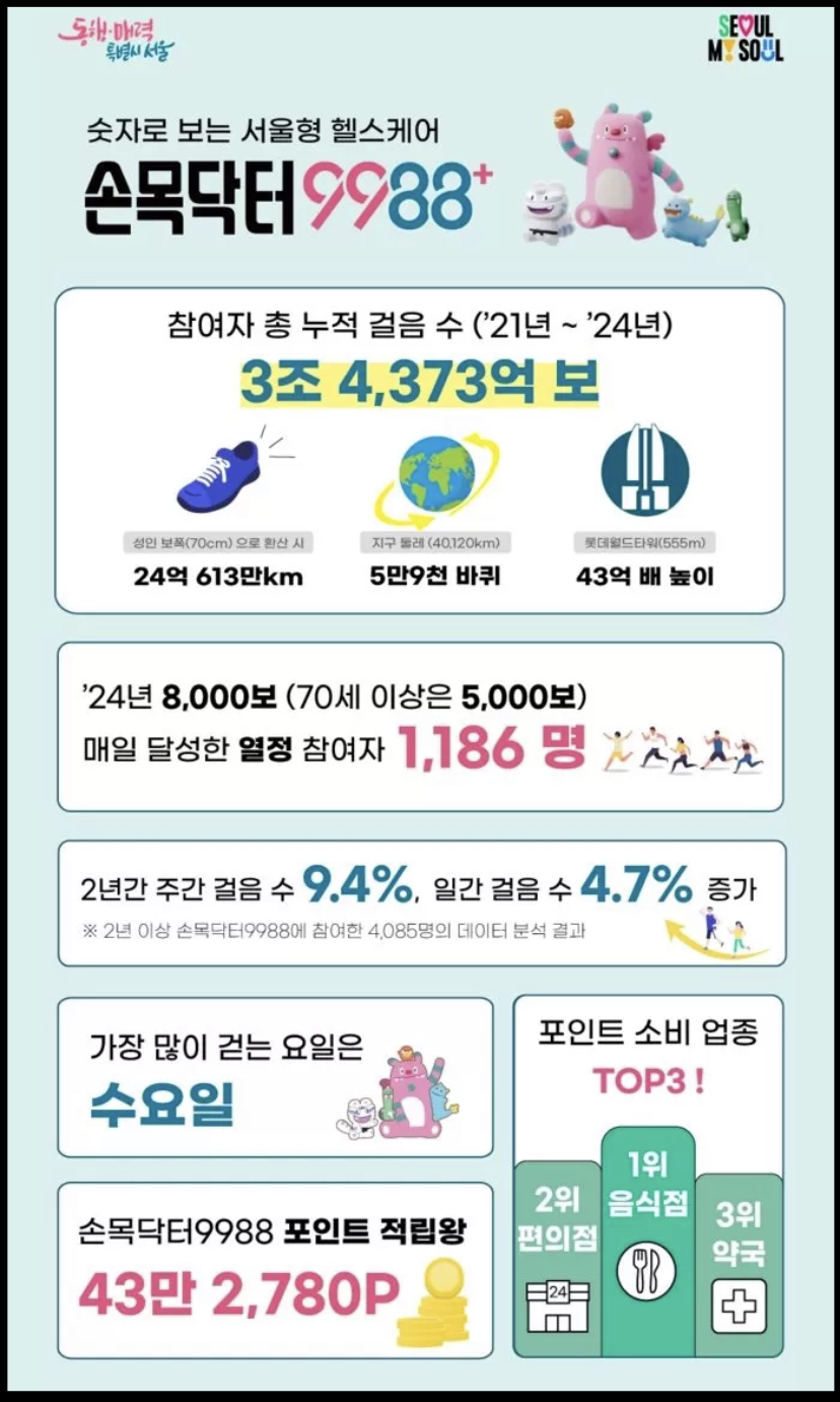 서울시는 지난 4년간 참여자들이 기록한 누적 걸음 수는 3조 4373억 보에 달한다고 했습니다. 이는 지구를 약 5만9973바퀴 도는 거리로, 롯데월드타워(555m) 높이의 약 43억 배에 해당하는 규모입니다.