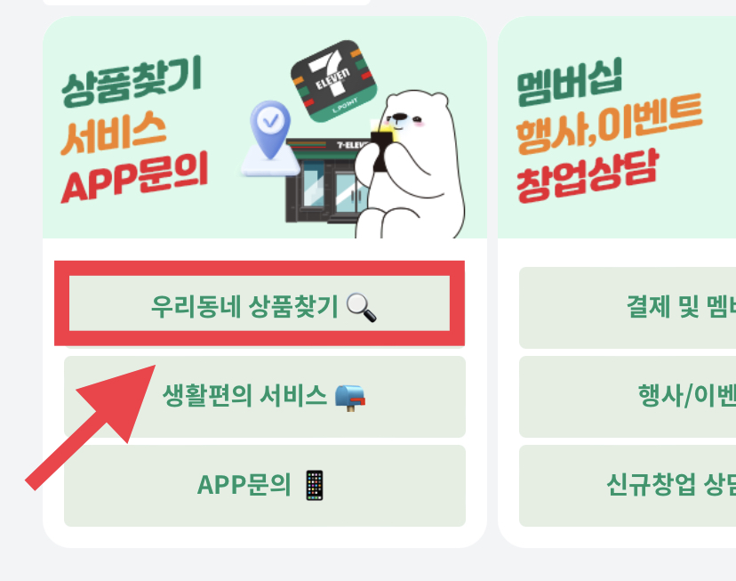 1. 세븐일레븐 앱을 다운 받아 열어보면 메인 화면에 우리동네 상품찾기가 뜹니다. 그걸 누르고 들어갑니다.