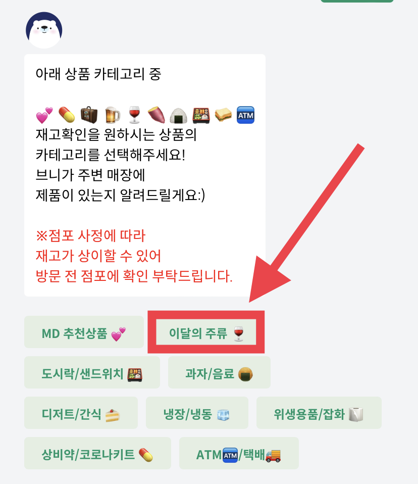 4. 아래 상품 카테고리 중 재고확인을 원하는 상품의 카테고리를 고르면 되는데요. 송가인의 생막걸리어라는 주류이기 때문에 주류를 선택합니다.