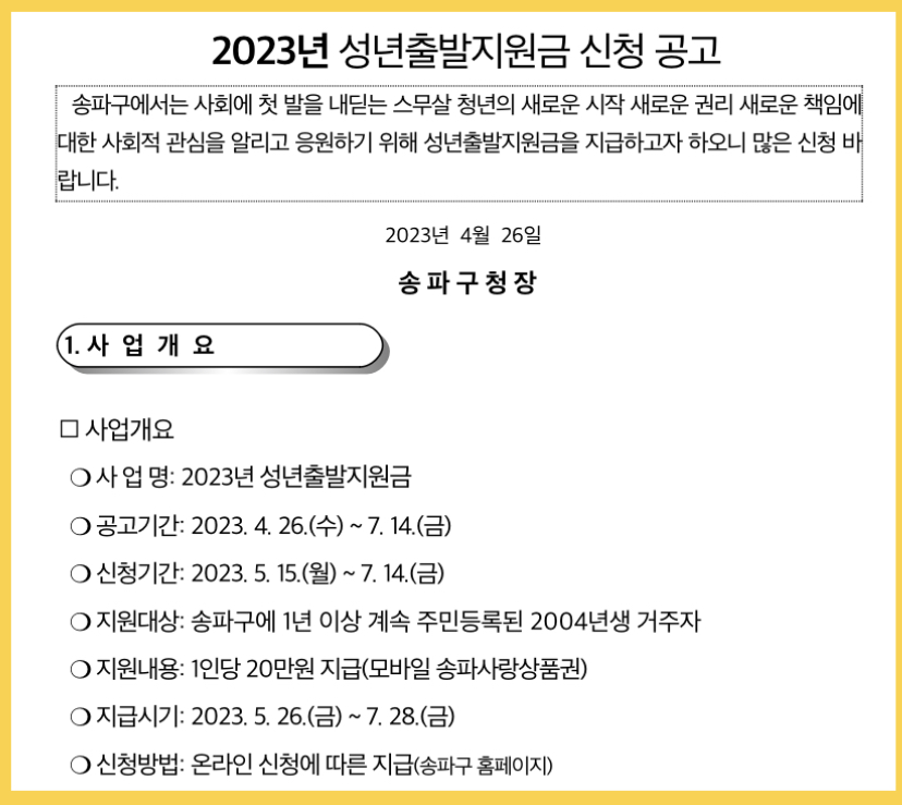 • 신청방법: 송파구청 누리집 홈페이지에서 회원가입을 한 후 성년출발지원금 메뉴에서 온라인 신청