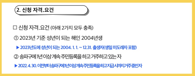 송파구민 중에 2023년 올해 성년을 맞는 2004년생(생일 미도래자 포함)입니다. 2022년 4월30일 이전부터 지급 시까지 송파구에 1년 이상 계속 주민등록을 하고 거주 중이어야 하니 꼭 확인하시기 바랍니다.