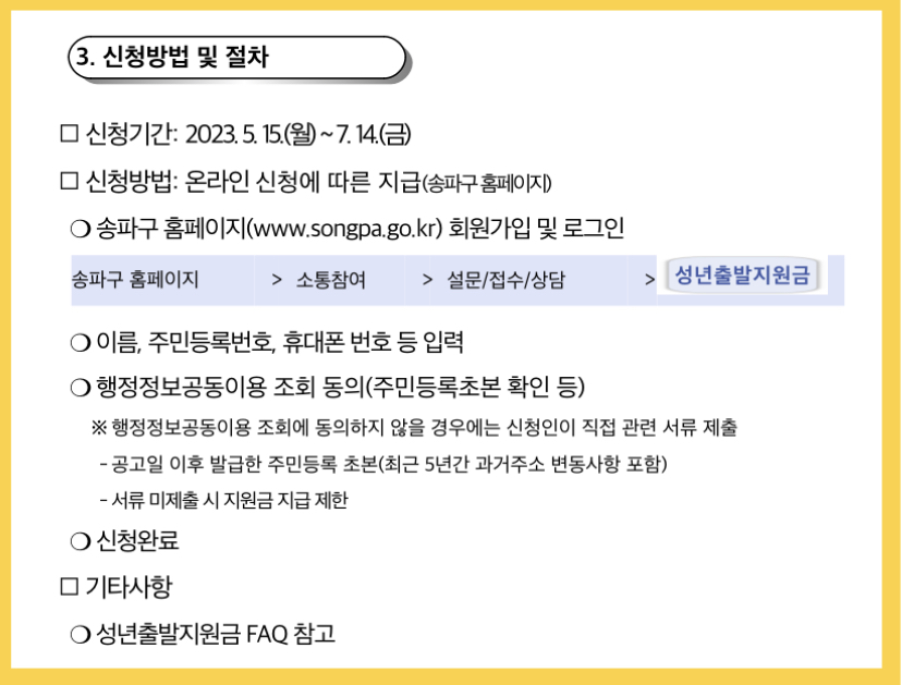 • 신청방법: 송파구청 누리집 홈페이지에서 회원가입을 한 후 성년출발지원금 메뉴에서 온라인 신청