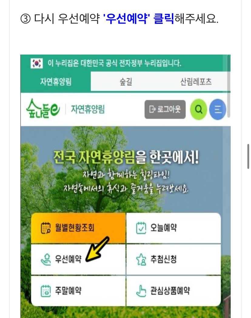 1. 숲나들e 홈페이지에 접속 후 우선예약을 클릭합니다.
