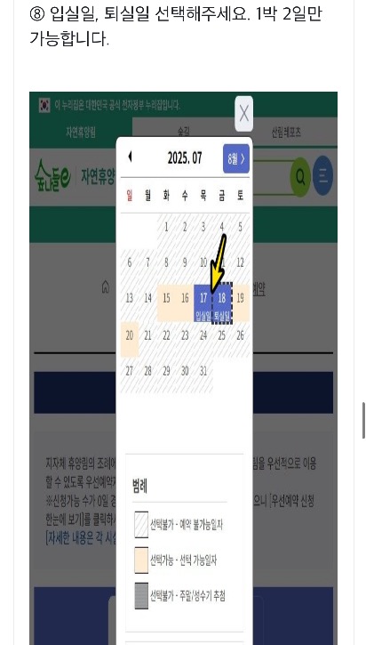 8. 입실일, 퇴실일 선택해주세요. 1박 2일만 가능합니다.