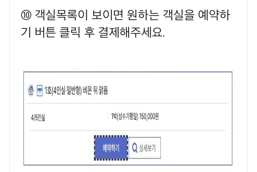 10. 객실목록이 보이면 원하는 객실을 예약하기 버튼 클릭 후 결제를 진행합니다.