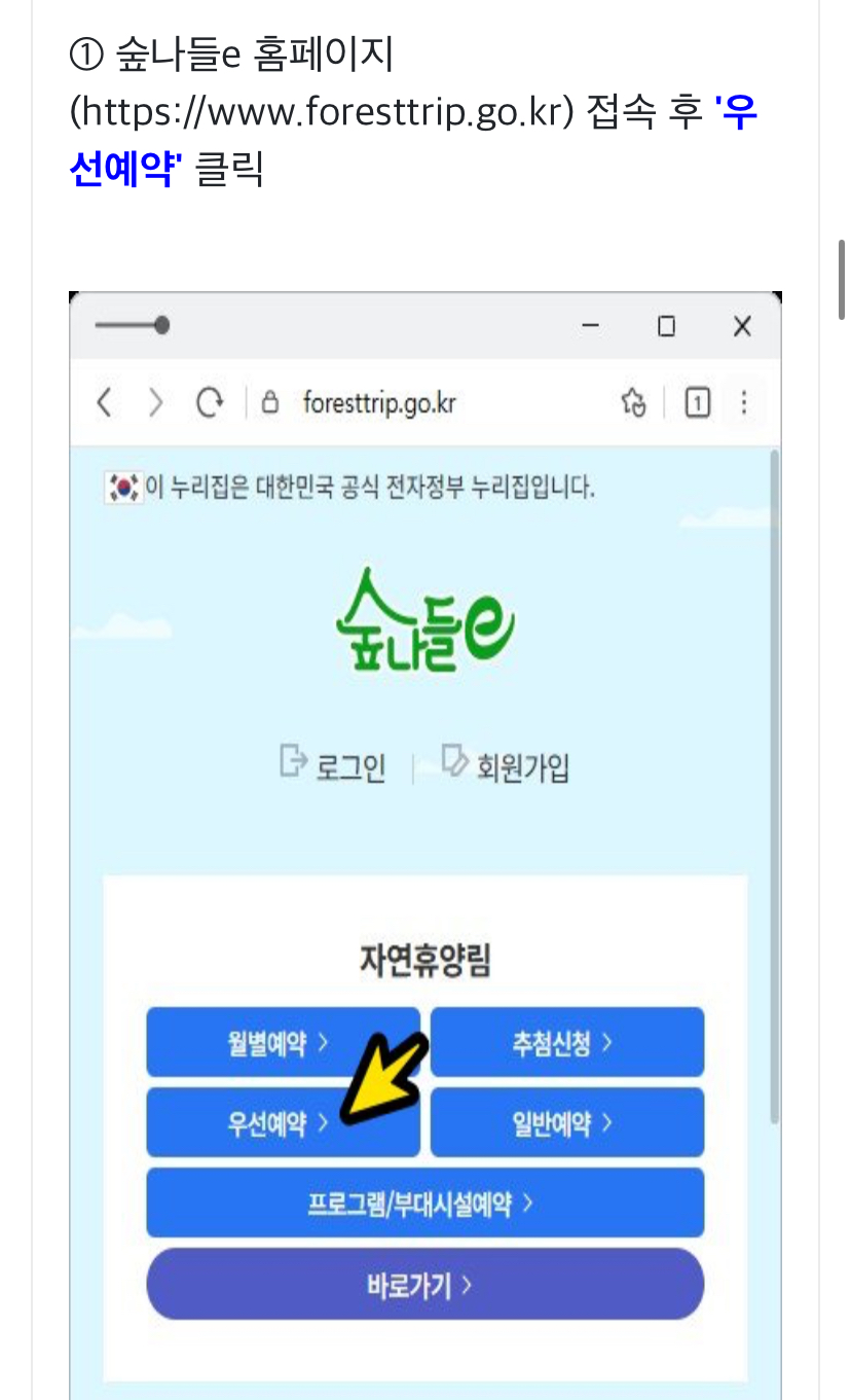 1. 숲나들e 홈페이지에 접속 후 우선예약을 클릭합니다.