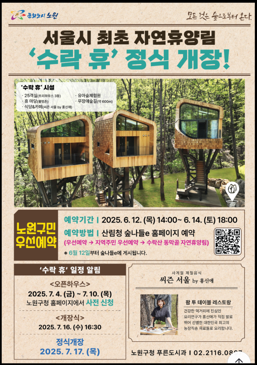 수락 휴는 노원구에서 울창한 숲을 지닌 수락산 동막골에 새로 조성하고 있는 자연휴양림입니다. 많은분들이 가까운 도심에서 즐길 수 있는 휴양림에서 즐기는 경험을 하고 싶어하시는데요. 그만큼 인기가 많을 것으로 예상됩니다. 수락휴 정식 개장이 7월 17일로 정해졌는데요. 수락휴 예약 방법을 궁금해하시는 분들을 위해 수락휴 트리하우스 신청 방법 홈페이지에 대해 자세히 알아봤습니다.